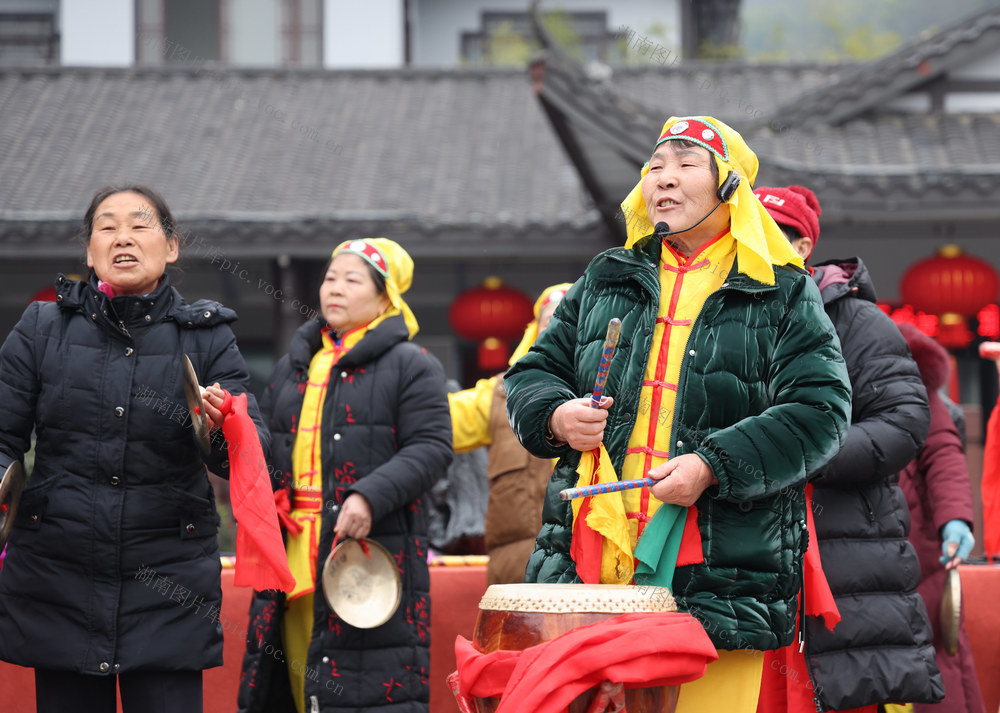 2025年2月12日,在张家界市武陵源区吴家峪门票站广场,当地群众表演民俗节目。 吴勇兵 摄