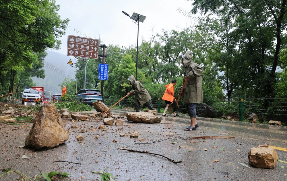 6月20日,张家界市武陵源区公路建设养护中心工作人员在疏通路面,清理滑坡体 。 吴勇兵 摄