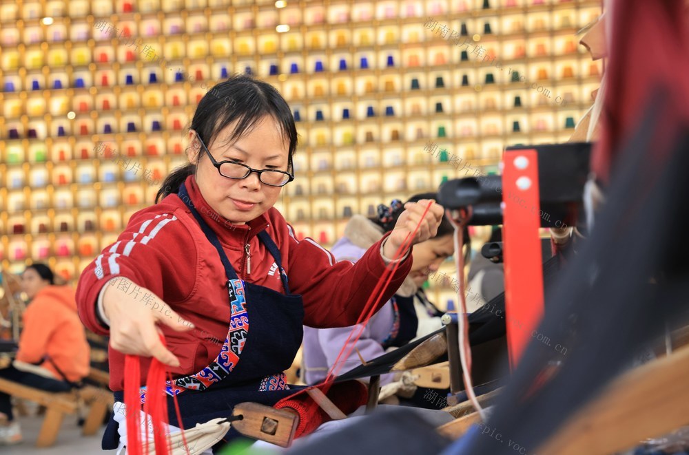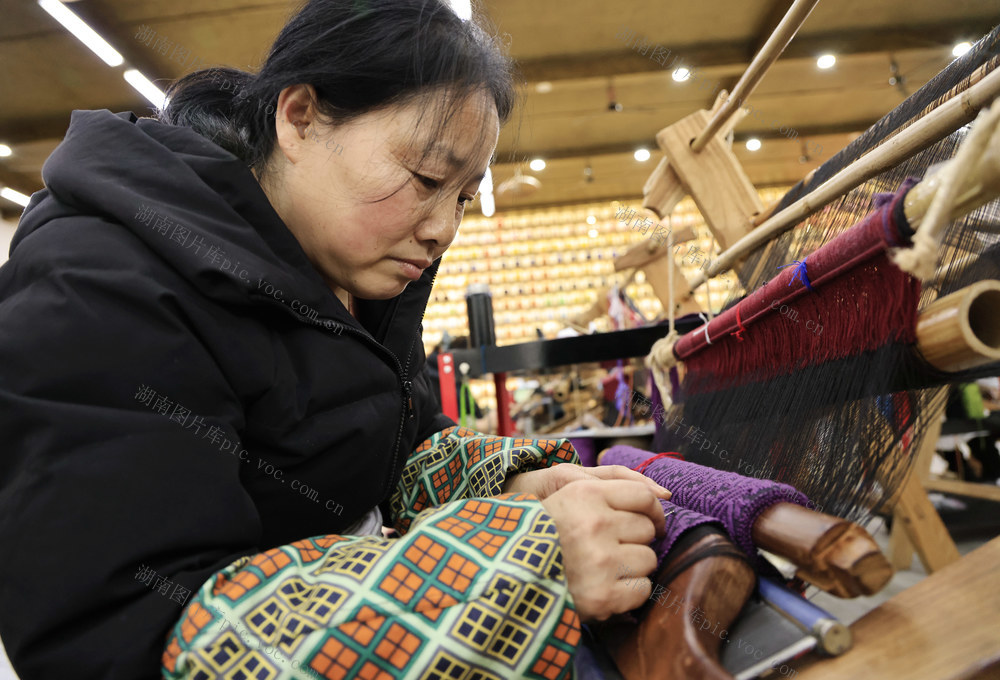 2026年1月4日,在张家界市武陵源区乖幺妹土家族织锦基地,工人在制作土家族织锦产品。(吴勇兵 摄)